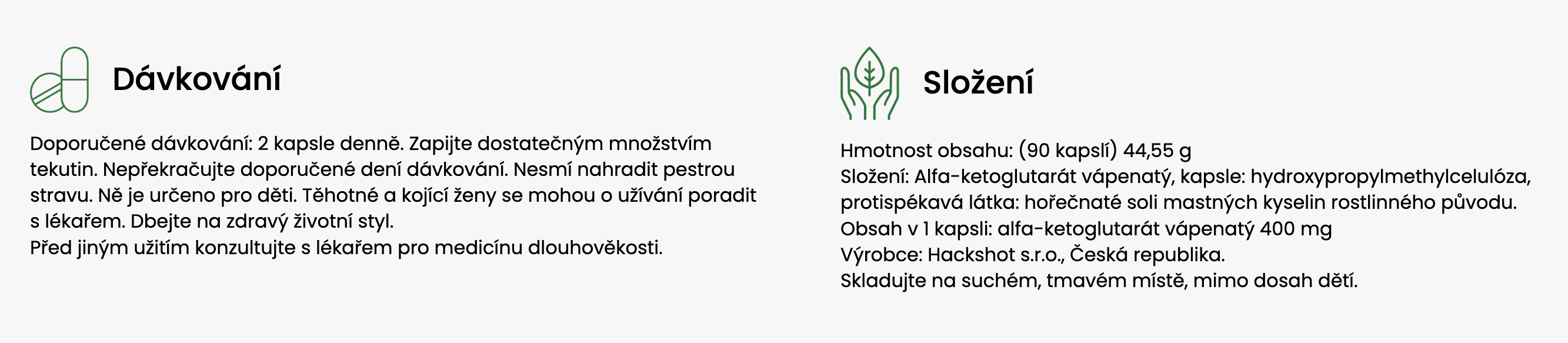 Denní dávka (2 kapsle) obsahuje 540 mg glycinu a 540 mg N-acetyl L-cysteinu.