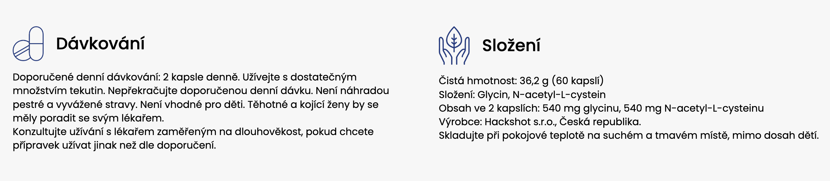 Denní dávka (2 kapsle) obsahuje 540 mg glycinu a 540 mg N-acetyl L-cysteinu.