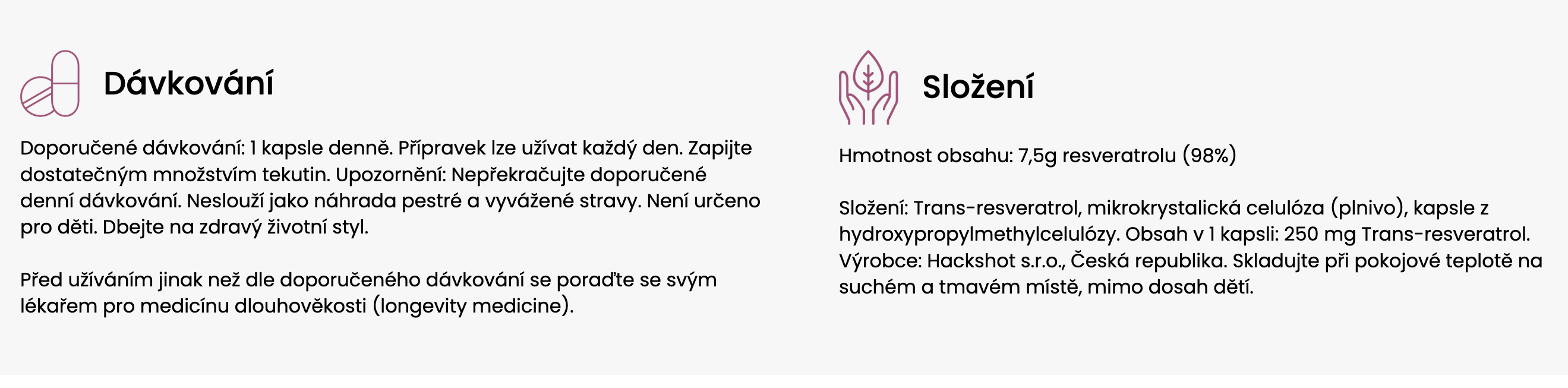 V jednom balení naleznete 30 kapslí s obsahem 250 mg přírodního trans resveratrolu. Každá kapsle je pečlivě zabalena v blistru, aby tak nedocházelo ke snižování obsahu působením vnějších vlivů.