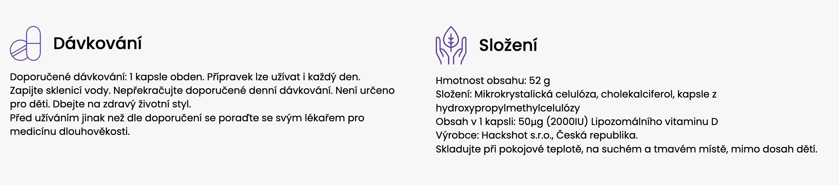 Denní dávka obsahuje 50 μg (2000 IU) Liposomálního Vitamínu D3.