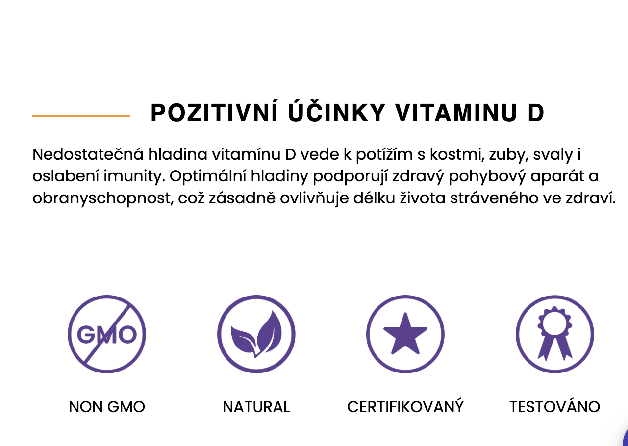 🦴 Vitamin D podporuje zdravé kosti, zuby a svaly, čímž přispívá k pohybovému aparátu a prevenci zlomenin.